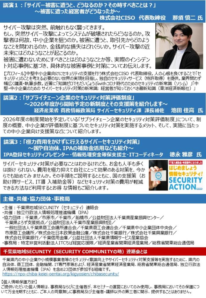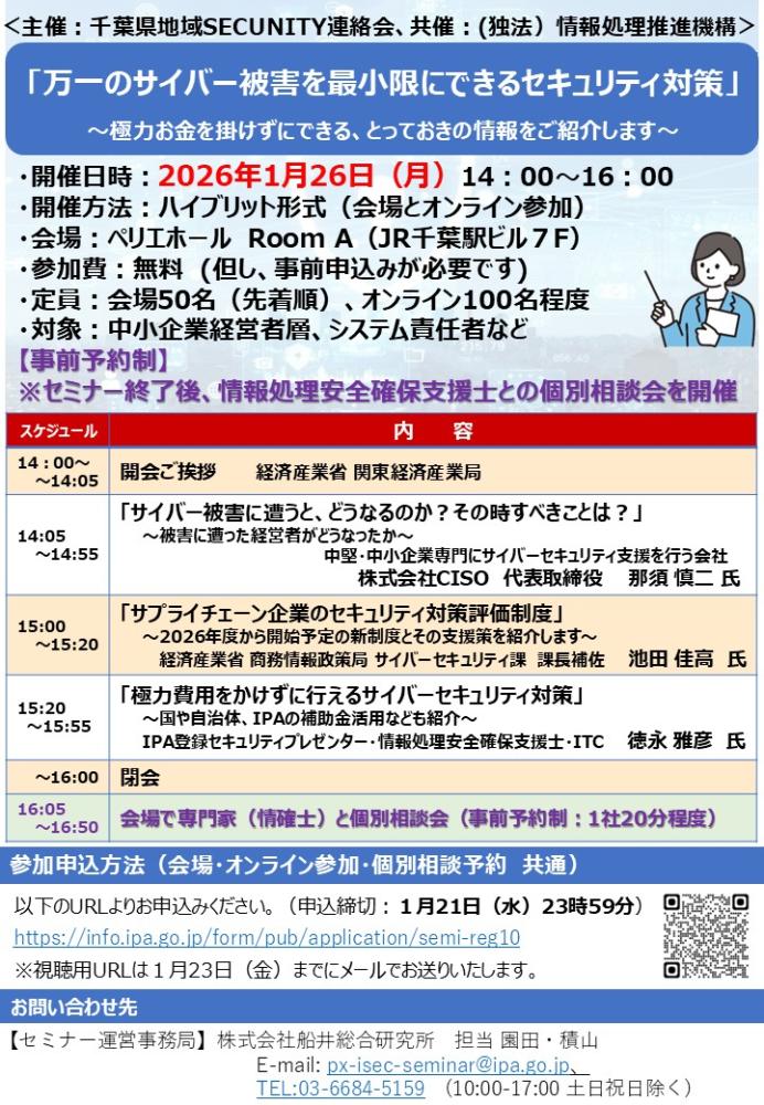 | イベント名 | 万一のサイバー被害を最小限にできるセキュリティ対策セミナー(2026年1月26日開催) 千葉県地域SECUNITY連絡会主催、IPA共催 |