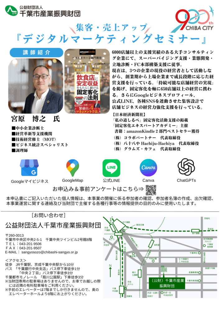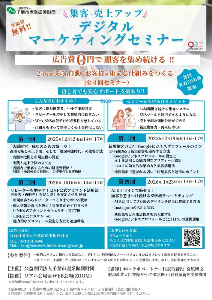 | 開催場所 | 【会場開催】 公益財団法人千葉市産業振興財団 会議室(千葉市中央区中央2-5-1 千葉中央ツインビル2号館8階) 【WEB開催】 ZOOM(URLは申し込み後メールにてご案内いたします) |