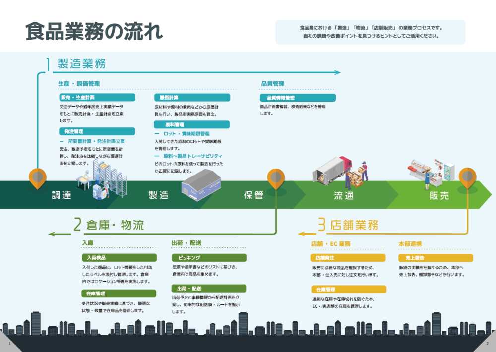 調達から製造、販売まで、食品業には多岐にわたるプロセスがあります。また、需要予測の難しさ、製造ロス、誤出荷、属人的な作業工程、煩雑な損益管理など、さまざまな課題があります。品質や安全性を確保しつつ、作業を効率化して低コストを実現するためには、すべての工程を一元的に管理できるシステムです。