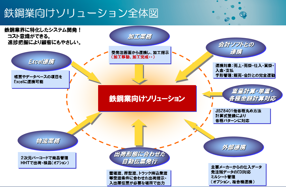 鉄鋼業界の特性に合わせた機能を提供する事で、顧客サービス、端材を含めた在庫精度、案件毎の利益の適正化、仕入れから加工・納品までの業務効率の向上に向けたシステムです。