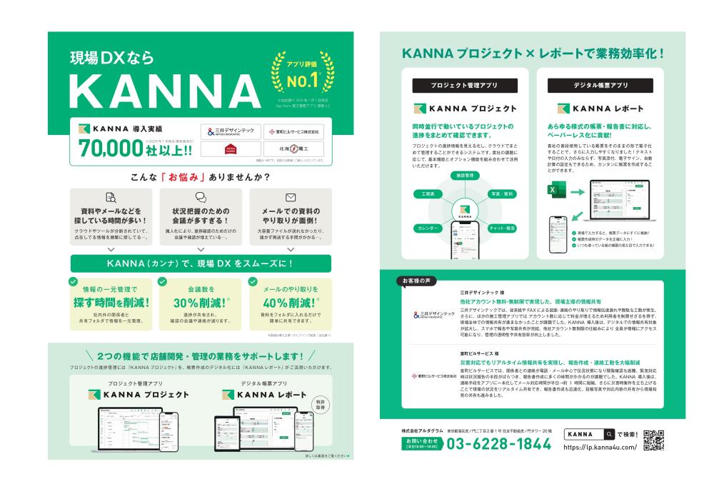 弊社株式会社アルダグラムでは、現場の施工管理ならびに納期やコストなどの計画を社内外問わず安全に共有できる現場DXサービス「KANNA」を開発・提供しております。