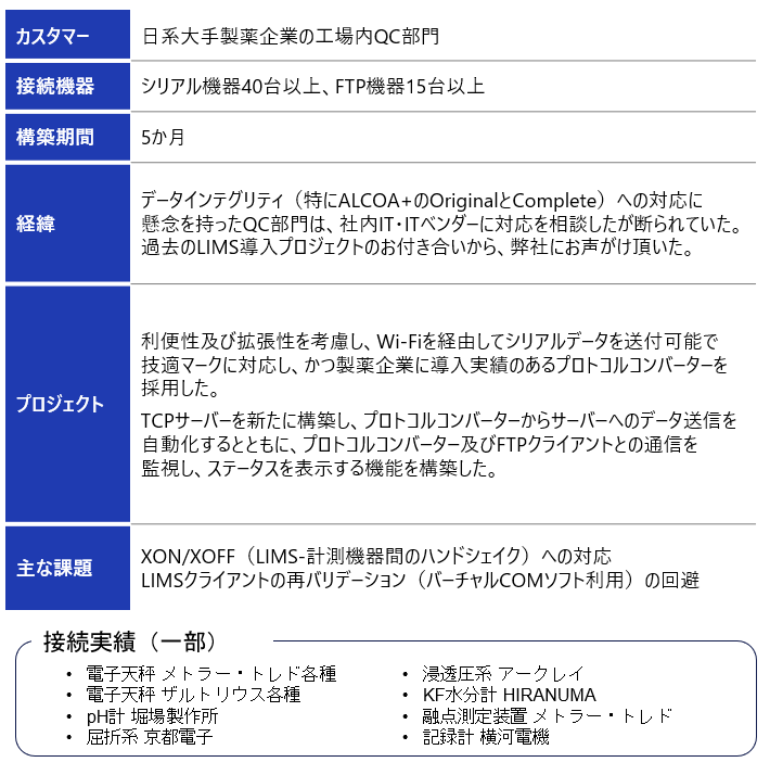 Pithias MDAは、LIMSによる天秤やpH計のデータ取込プログラムに影響を与えずに導入することができます。 これはLIMSクライアントの再バリデーションを回避し、導入に伴う不要なコストを削減することを意味します。