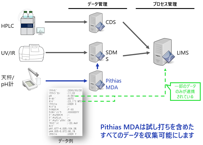 Pithias MDAは通常は破棄されてしまう、天秤やpH計のメタデータを完全な形で、漏れなくファイル化することが可能です。