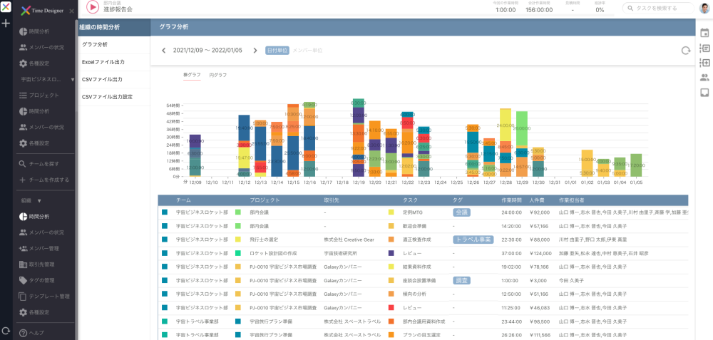 ・メンバーの人件費情報を登録することで、各作業の人件費も分析することができます。