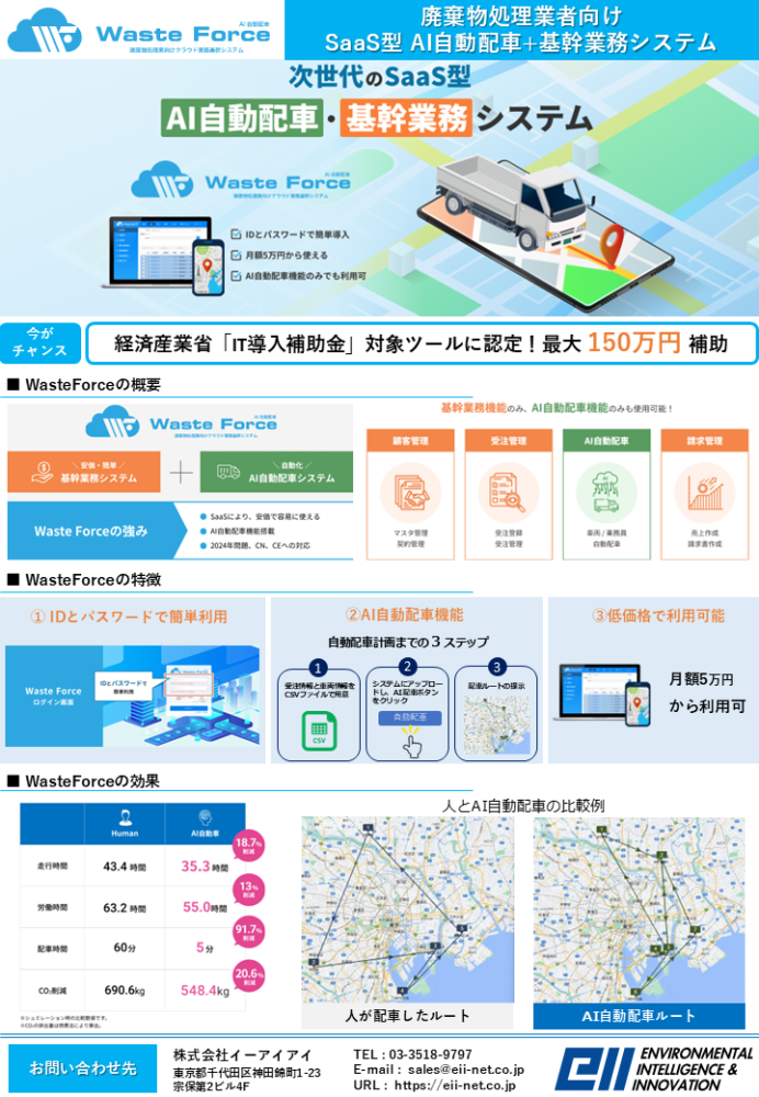 WasteForce…受注データを基に翌日以降の配送ルート構築を自動化。AI自動配車機能のみでも利用可能 https://wasteforce.swm-eii.com/
