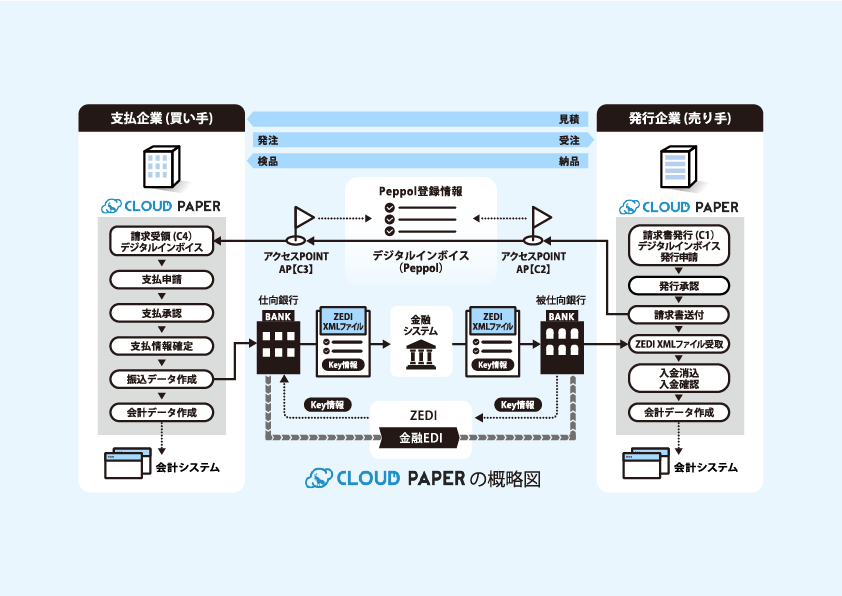 取引先が異なるシステムを使用していてもネットワークにつながっている者同士で電子文書のやり取りができ、請求情報を自動で取り込めるようになります。