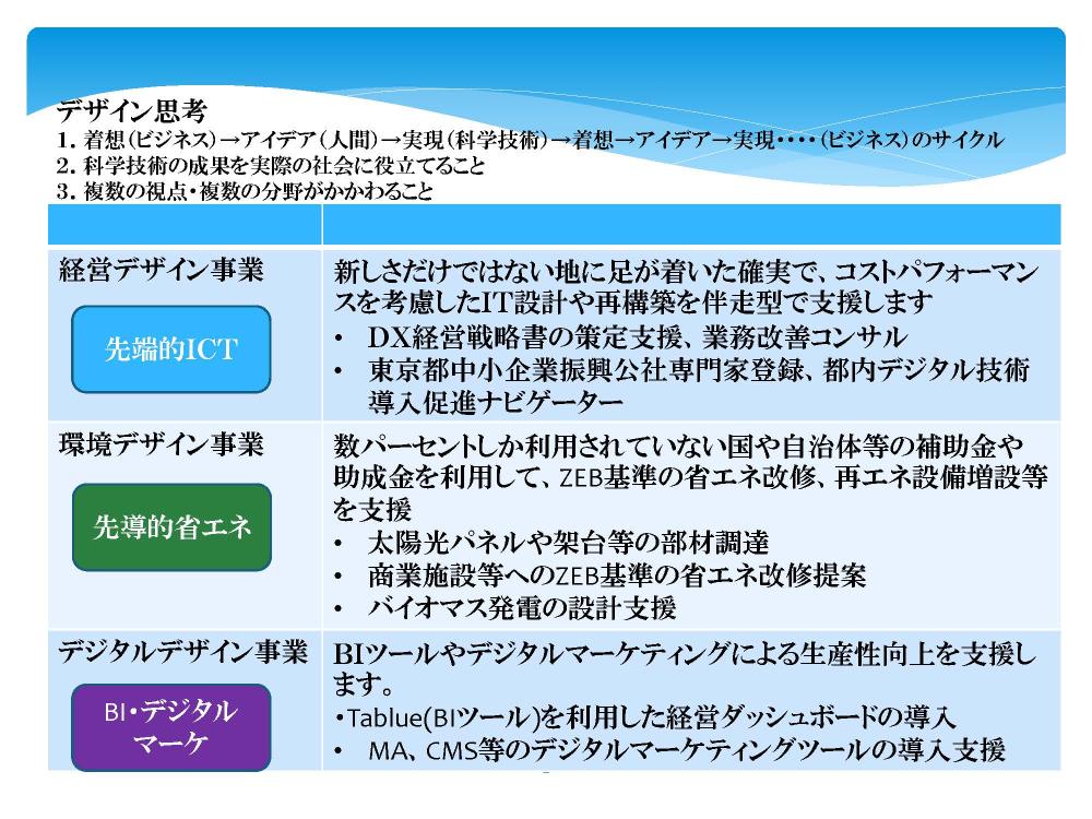 また、GX及びDXのいずれでも政府や自治体の補助金を活用して、デザイン思考で中小企業にコスト削減や生産性向上を支援しております。