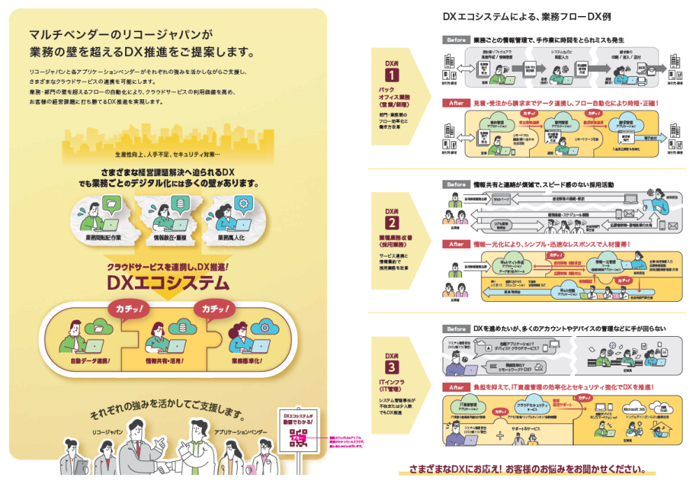 リコージャパンのDX提案は、マルチベンダー連携によるDXエコシステムを基盤とし、AI・業務アプリ・デバイス・保守サービスを一体として提供できる点が特徴です。