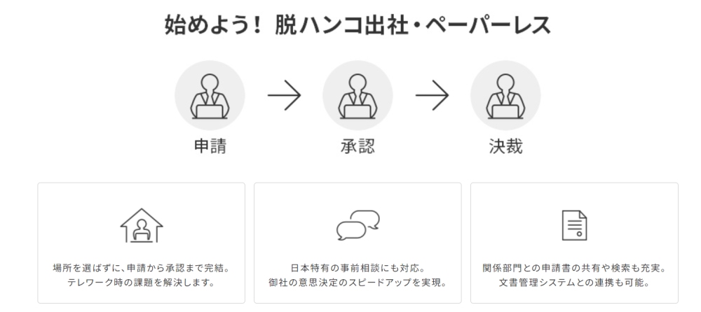 稟議書(りんぎしょ)や交通費などの経費精算や各種申請書の電子決裁に利用でき、決裁にかかる時間の短縮や業務手順の遵守、必要書類の検索、他システムとの連携も可能です。