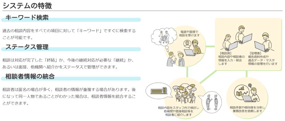 過去の相談履歴の検索がしやすくなり、同じ相談者の方への対応や類似事例への対応がどの相談員も同じようにできるようになります。