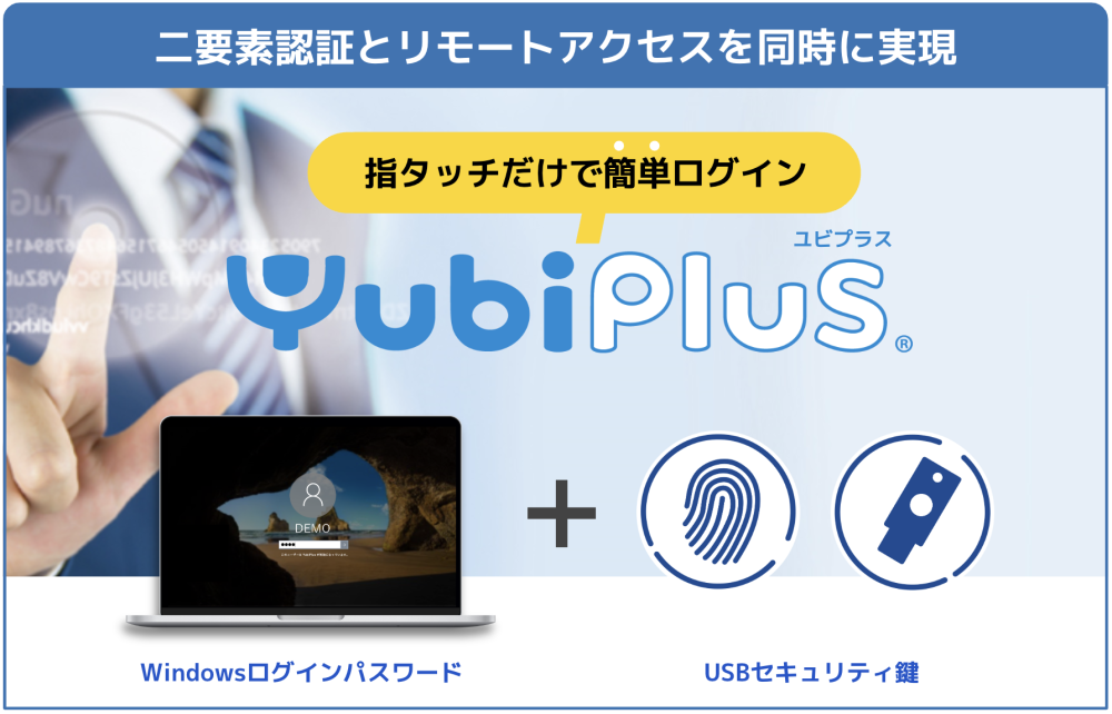 Yubi Plus(ユビプラス)は、USBセキュリティ鍵にタッチするだけの簡単操作でPCの二要素認証ログインと働き方改革に有効なリモートアクセスを安心・安全・簡単に提供します。