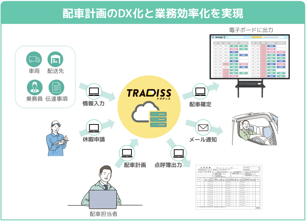 物流業界では乗務員の「時間外労働の上限規制」が適用され、物流DXは必要不可欠となっています。配車に必要な情報をデジタル化により一元管理し、配車計画表を電子ボードに表示する配車支援システム「Tradiss」のご利用で、業務効率化と働き方改革を推進します。