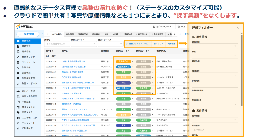 案件の詳細情報や工程・ステータスを管理できます。見積や請求の漏れを防ぐことができます。