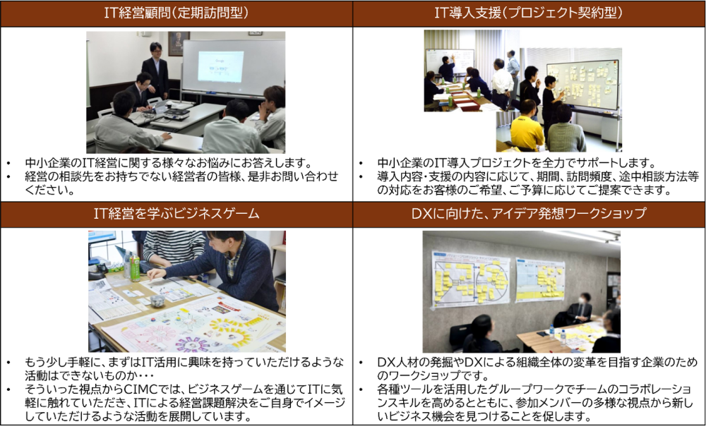 また、コンサルティング現場で得た“あるある話”を盛り込んだ「IT経営ビジネスゲーム」や、DX推進に向けた「アイデア発想ワークショップ」などの研修も承っております。