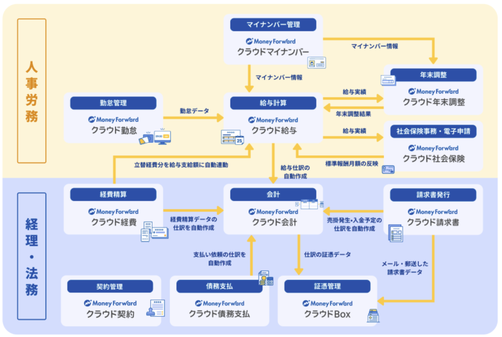 マネーフォワード クラウドは経理・人事労務などバックオフィスのあらゆる課題解決をサポートするクラウド型のサービスです。会計・経理といった業務はもちろん、人事労務や電子契約などの領域もカバーしていています。