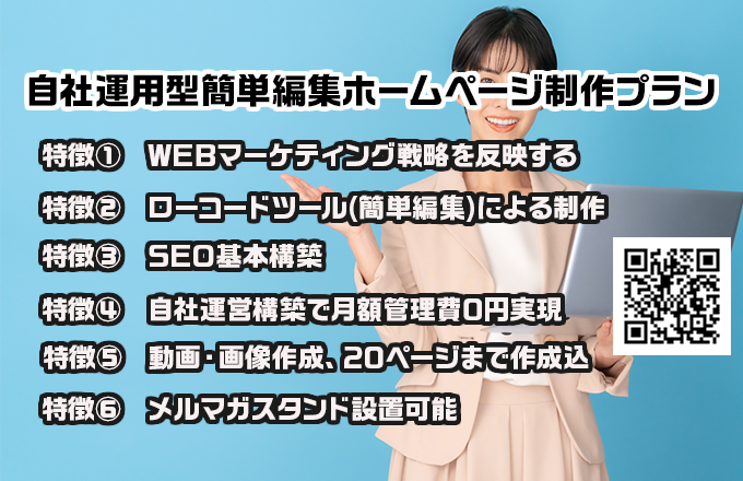 中小企業で自社運営で顧客獲得ができるWEBサイト制作 戦略から情報発信指導までサポート SEO対策 ローコード制作ページ数20ページまで込み価格 自動バックアップで月額サポートなし 動画画像撮影つき