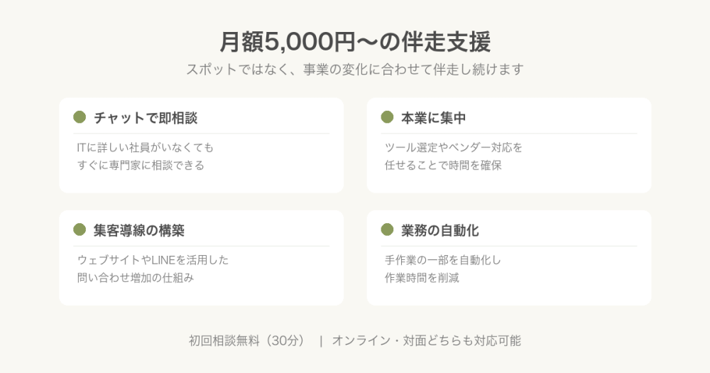 チャットでの随時相談、ITツール選定・導入支援、ベンダー折衝サポート