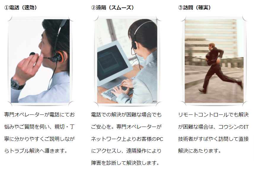 ・電話による対応はもちろん、遠隔操作によるリモートサポート、オンサイト保守にも対応