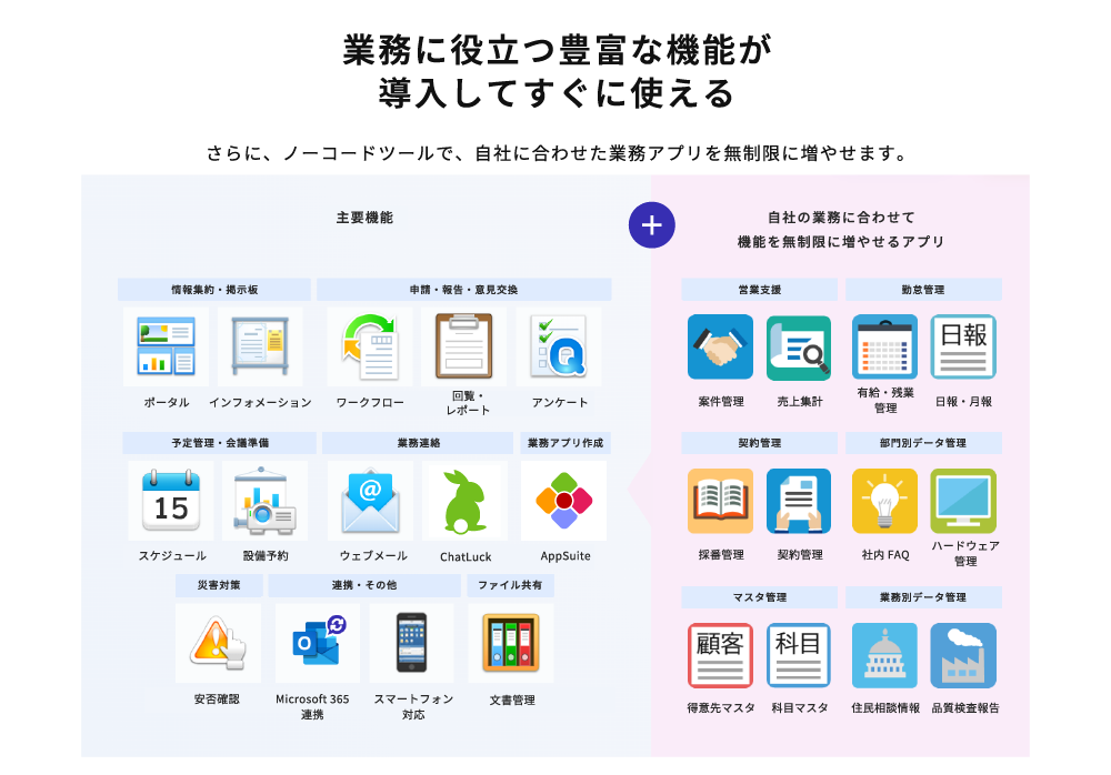 ・ポータル、スケジュール、申請管理、文書管理など、情報共有に必要な機能をすべて搭載