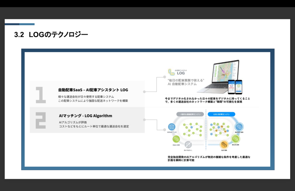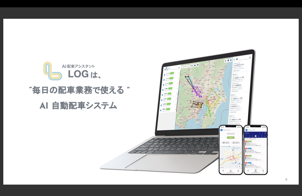 ・AIを活用した自動配車システム「LOG」で、最適な配送計画を瞬時に作成。コスト削減と業務効率化を実現します。