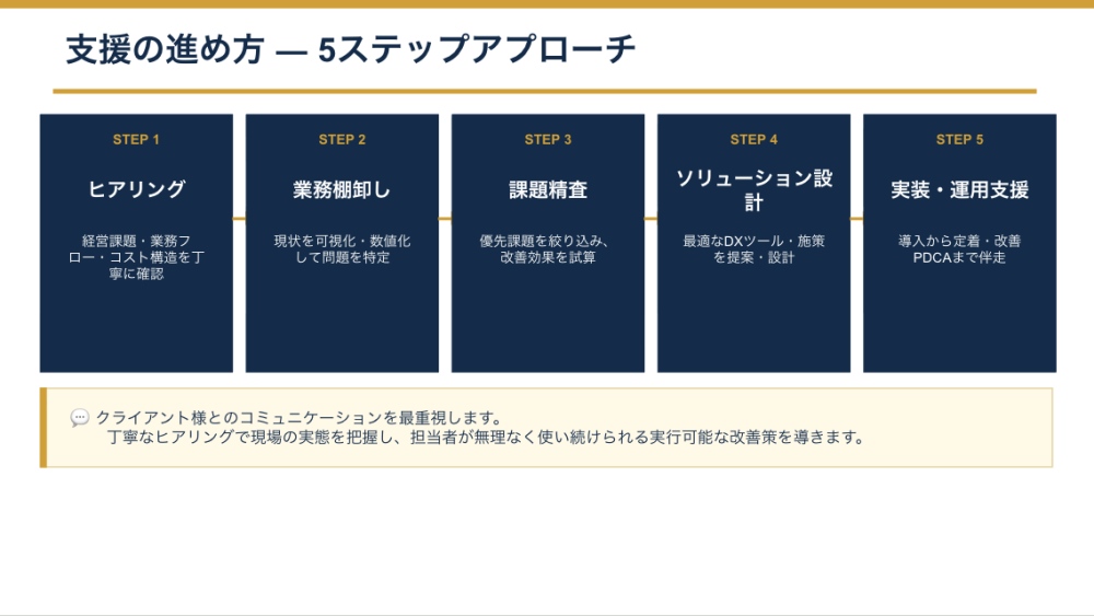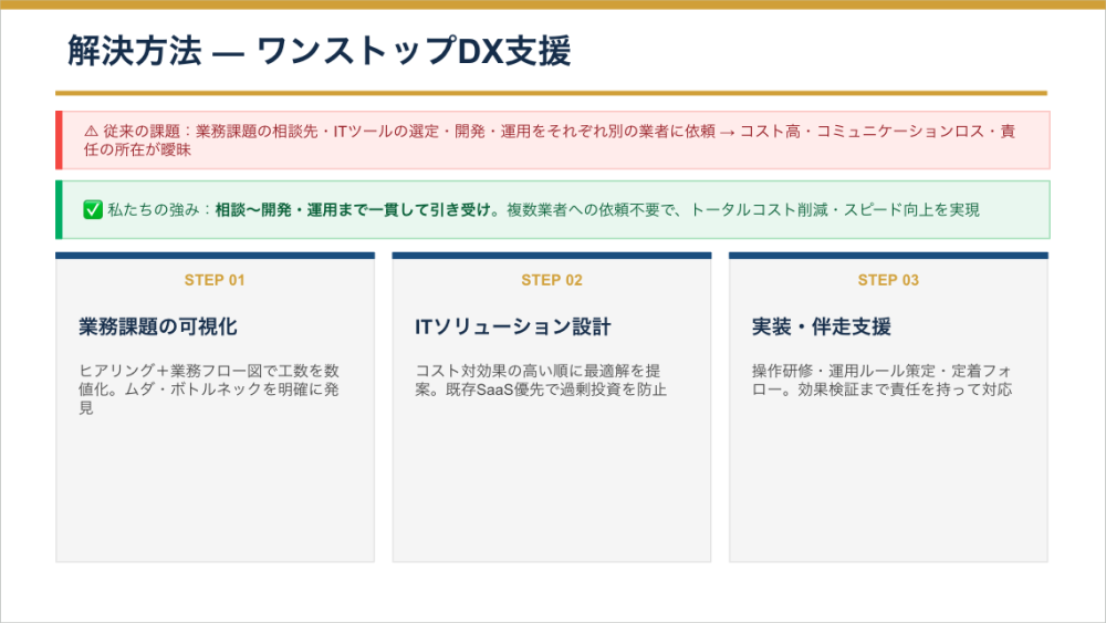 ヒアリングから実装・運用まで一貫したワンストップDX支援を提供します。業務フロー図を用いた課題の可視化・数値化、コスト対効果の高いITソリューション設計(既存SaaS優先)、導入後の操作研修・定着フォロー・効果検証まで一社で対応します。ITベンダーと業務コンサルの窓口が分かれることによるコミュニケーションロスや責任の曖昧さを解消し、スピーディーかつ低コストでDXを実現します。