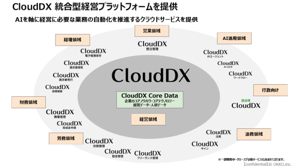 顧客管理(CRM/SFA/名刺管理),販売管理,予約管理,受注管理,工程管理,在庫管理,財務会計、経費精算,給与計算,人事労務管理,勤怠・シフト管理,講座・研修,サイバーセキュリティ対策,AI