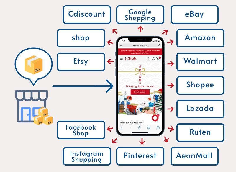 j-Grab Mallは、海外PL保険付きで日本の商品やブランドを世界中に販売できる越境ECプラットフォームです。eBay、Amazon、Walmart、Shopeeなどの海外主要ECモール、海外のリアルショップ(ショールームストア)、SNSチャネルを活用して委託販売します。