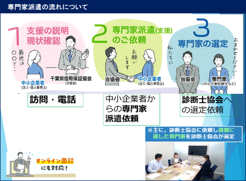 ・専門家の派遣については、当協会担当者と専門家が直接相談企業様へ訪問します。