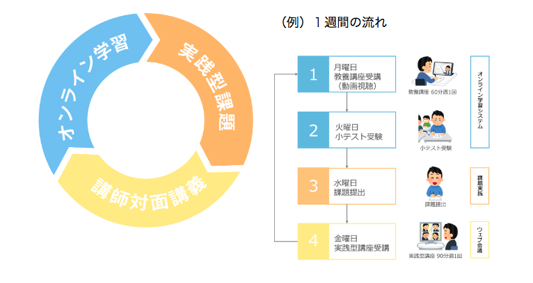 20年のデジタル知識の遅れを3ヶ月で取り戻し、社内のIT担当者を作る中小企業向けの研修プログラムです。各地のDX学校のIT導入診断士が担任となり、eラーニングの各回の解説を行ったり、SaaSの使用方法を直接指導したりする講義が行われます。ウェブ会議システムには担任が受講者のパソコンをリモート・コントロールして実際に操作したり「ここをクリックしてください」と指示したりすることもできるので、ITリテラシーに自信のない方でも受講できます。