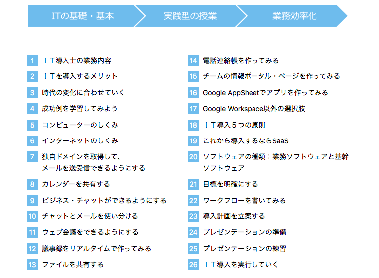 IT導入士初級講座:3ヶ月で社内にIT担当者をつくる実践的なIT研修です。ITの基礎・基本から始まり、国際標準のクラウドツール活用方法など、仕事に活かせる知識とスキルが身につきます。カリキュラム後半ではIT導入の計画・立案、実行手順まで学ぶことができます。