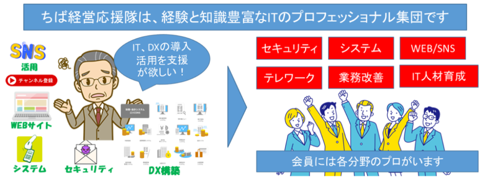 私たちは中小企業のITを活用した経営力向上を経営者の立場に立ってお手伝いします!ITCちば経営応援隊(約80名)は、全員が【経済産業省推進資格】ITコーディネータの資格保有者で経営とIT(DX)の専門家集団です。個々の企業に適したIT活用やシステム導入を、中立・公正な立場で企画段階から利活用・評価(モニタリング)まで一貫してアドバイスします。