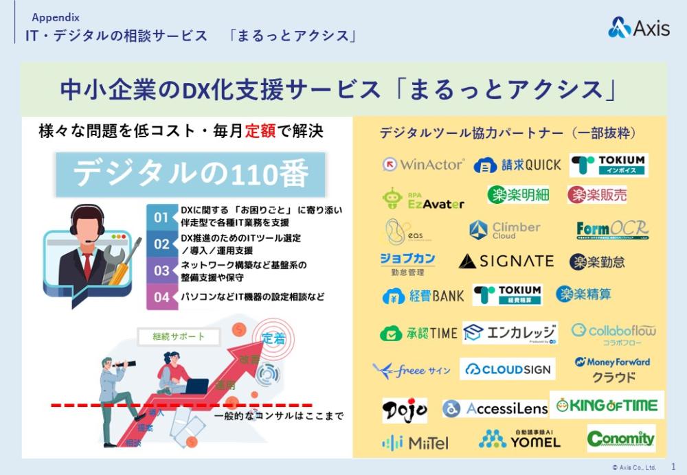 ・「まるっとアクシス」 は、中小企業様の課題やお悩みを【デジタルの110番】として 「まるっと」 解決していきます。