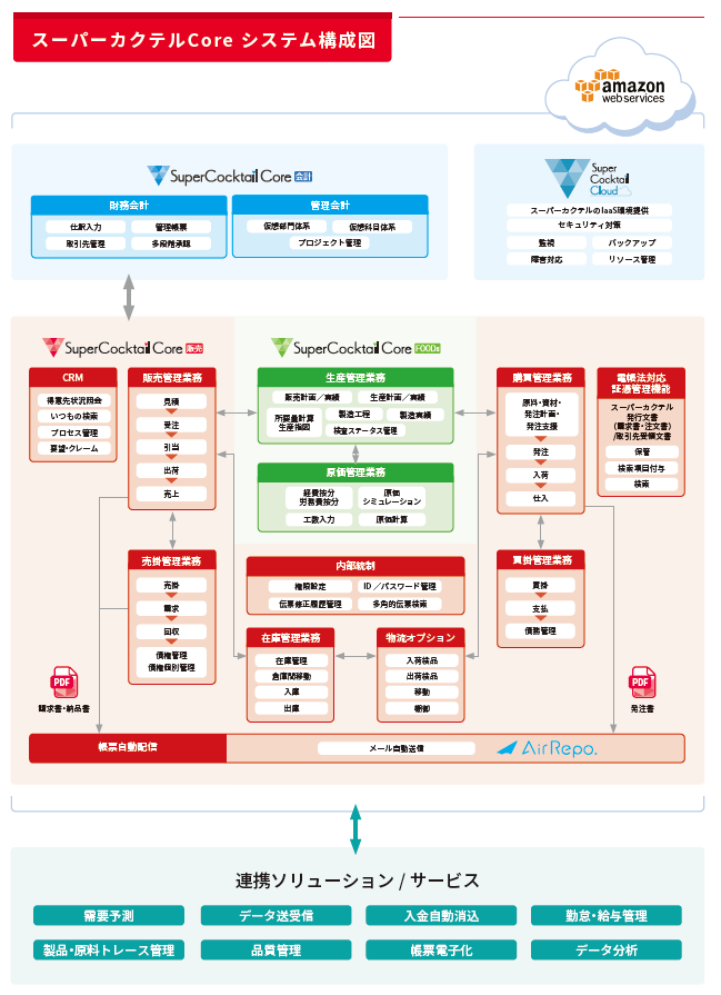 ・需要予測システムやEDI、RPA、品質管理、電子帳票、BIなどの様々なサービスやデータとシームレスに連携し、経営情報の“コア”としてお客様とともに成長していきます。